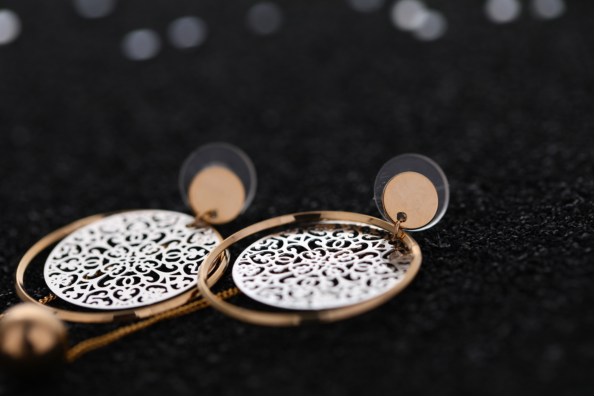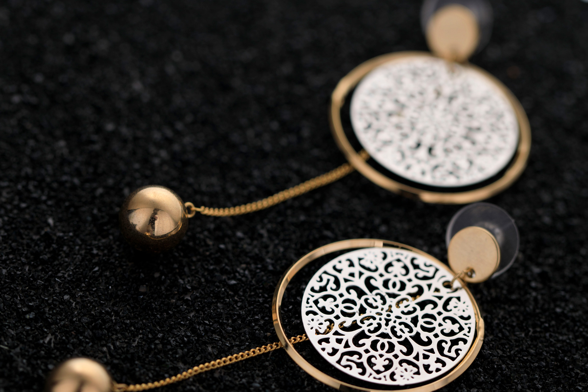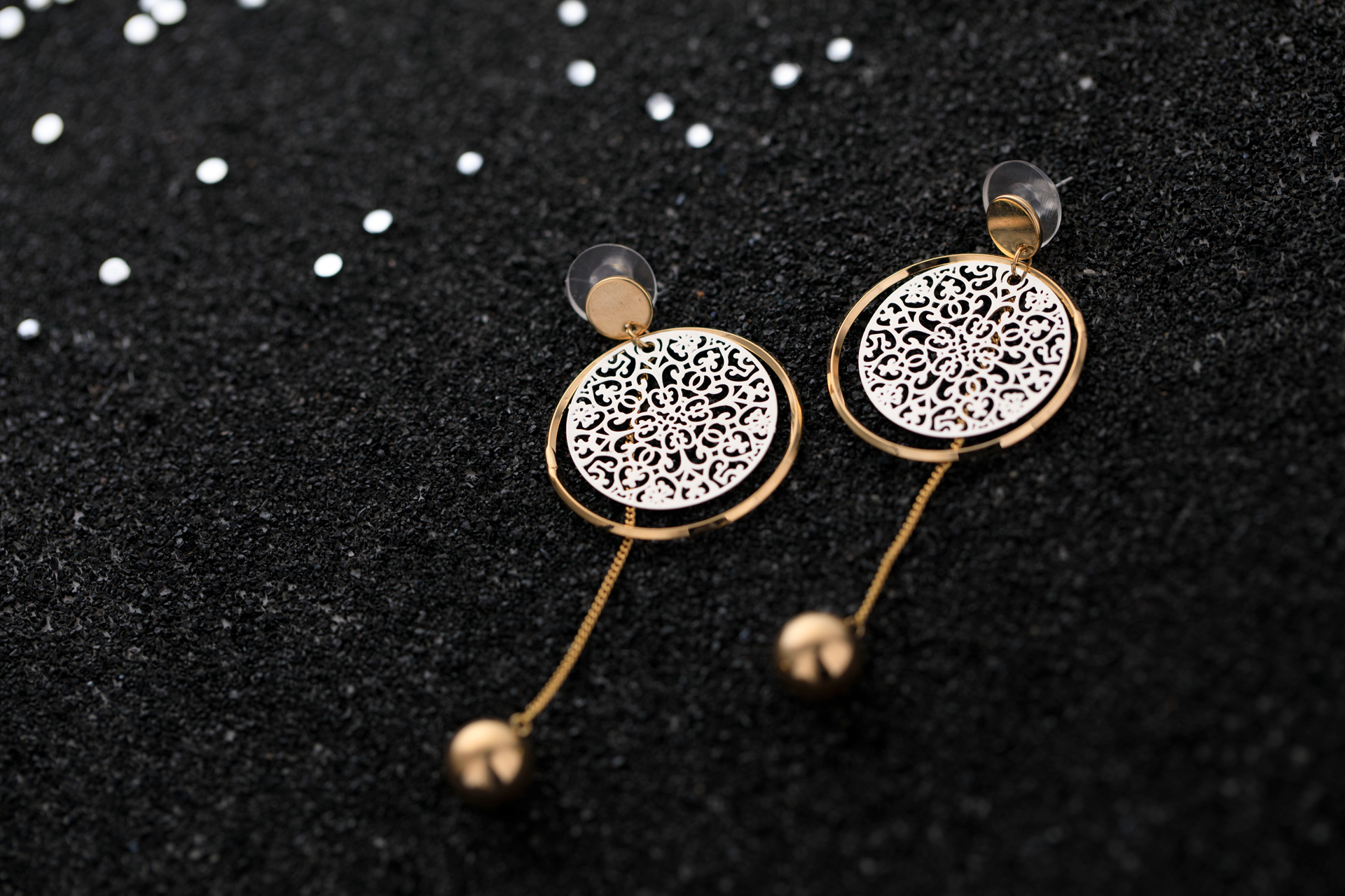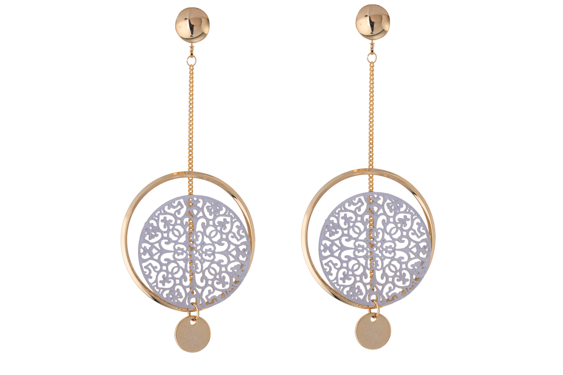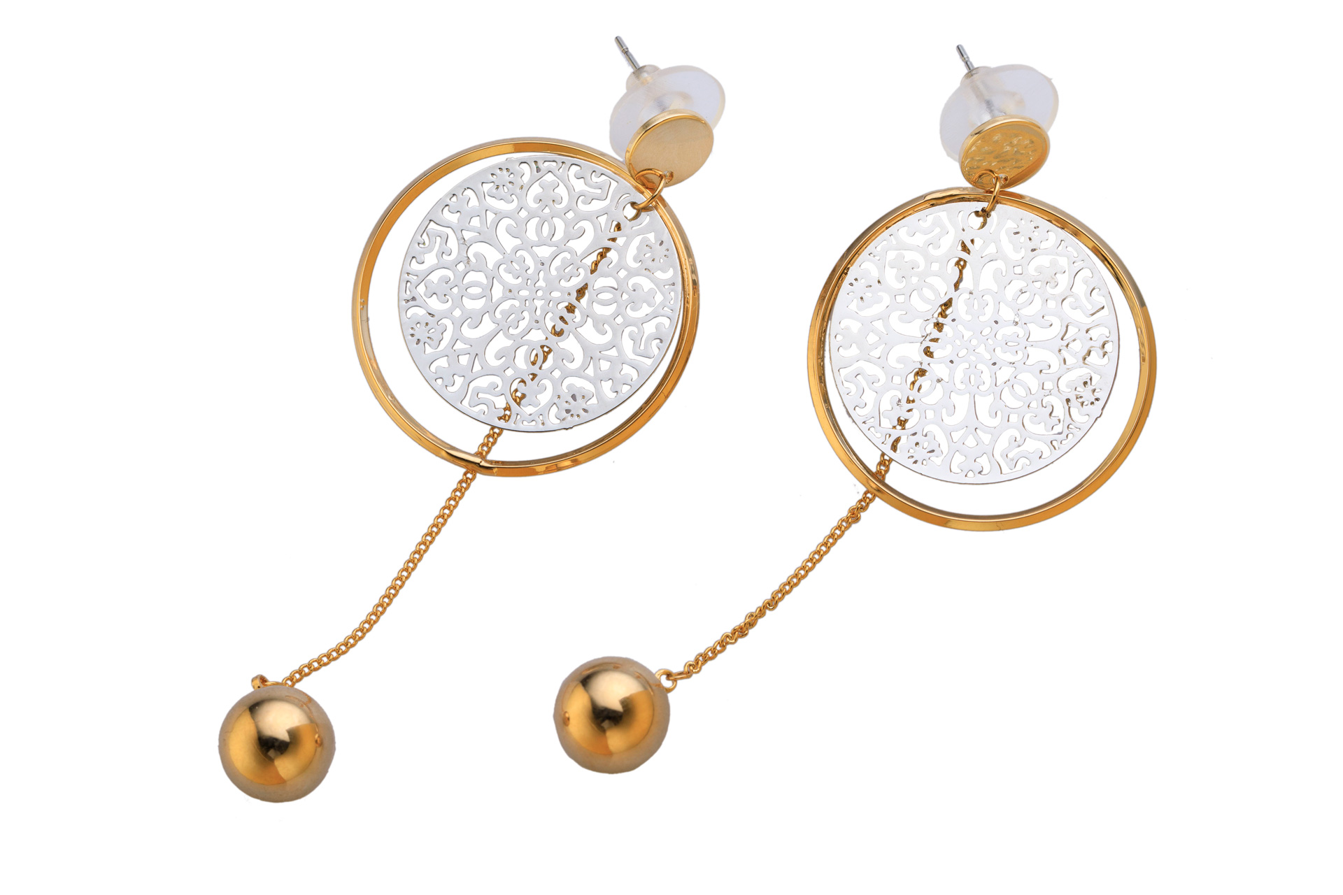 Boucles silver et gold. Anneaux dorés, chaines et boules. Les cercles sont ajourés en forme de rosaces et de coloris silver. Longueur env. 6 cm Acier inoxydable haut de gamme Très léger à porter
