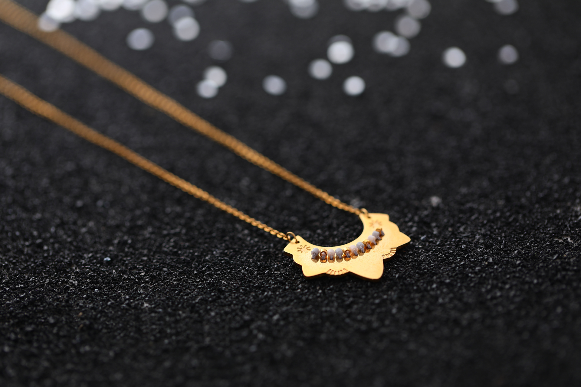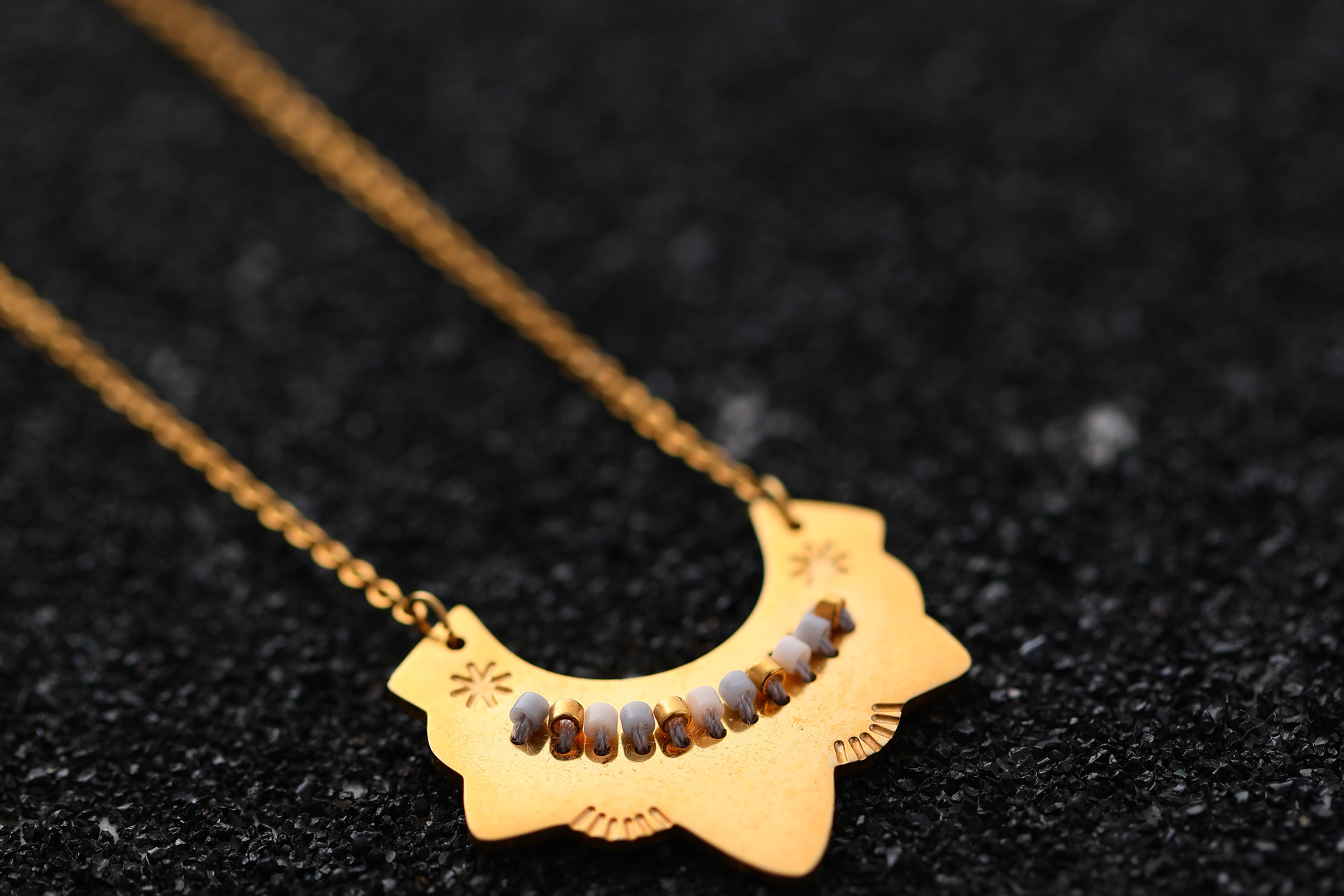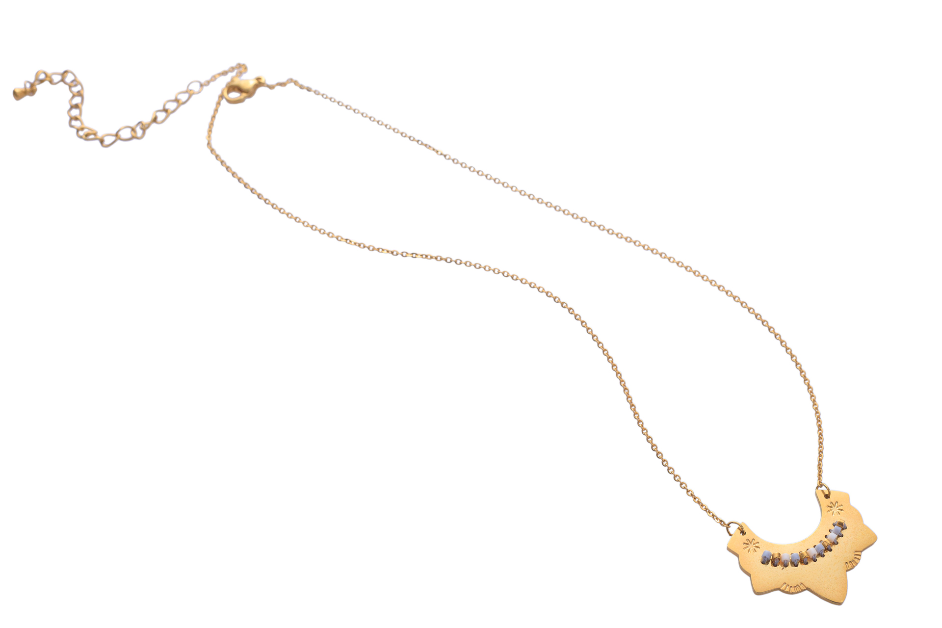 Collier au design égyptien Largeur x hauteur du pendentif : env. 2,6 x 2,5 cm Longueur chaîne : 46 cm + 5,5 cm de extension Poids : 5g. Couleur : or et perles Pendentif : Haut. 6 cm Larg. 6 cm Matériaux : Acier haut de gamme plaqué or